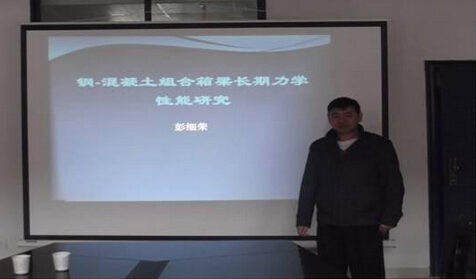讨论会上,彭老师提出了一些他在研究过程中思考的问题。钢-混凝土组合箱梁是钢梁和混凝土板通过剪力连接件连接形成整体工作的受弯构件。在长期荷载作用下,混凝土会产生徐变收缩,而钢没有这种现象,两种材料的差异会导致截面上的应力重分布,并致使结构产生大量的附加变形,在大型、复杂的结构中,徐变收缩产生的后果相对来说更为严重,这种效应将使得连接件的负担加重,甚至可能产生大量滑移,严重影响组合箱梁钢与混凝土共同工作的性能,因而该课题将是一个很有价值的研究方向。在长时间的作用下钢的腐蚀程度,以及如何减少这种腐蚀是彭老师主要的研究选择。与会的老师也各自发表了自己的看法并展开了讨论,使得解决问题的方法更加成熟。
